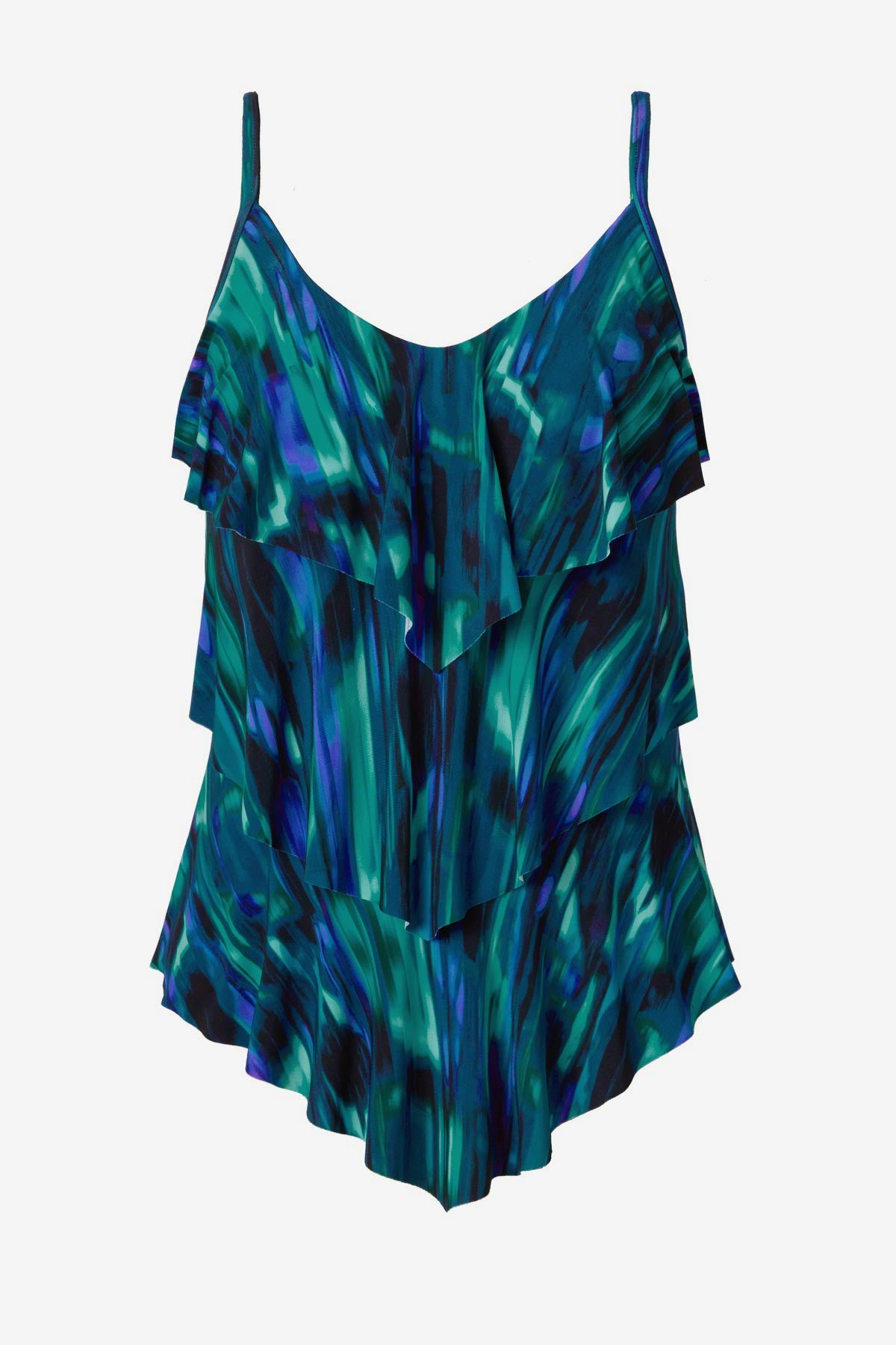Cascading front tiers conceal the waist while moving fluidly with you. Adjustable straps provide lift and support for a lengthened, refined silhouette.