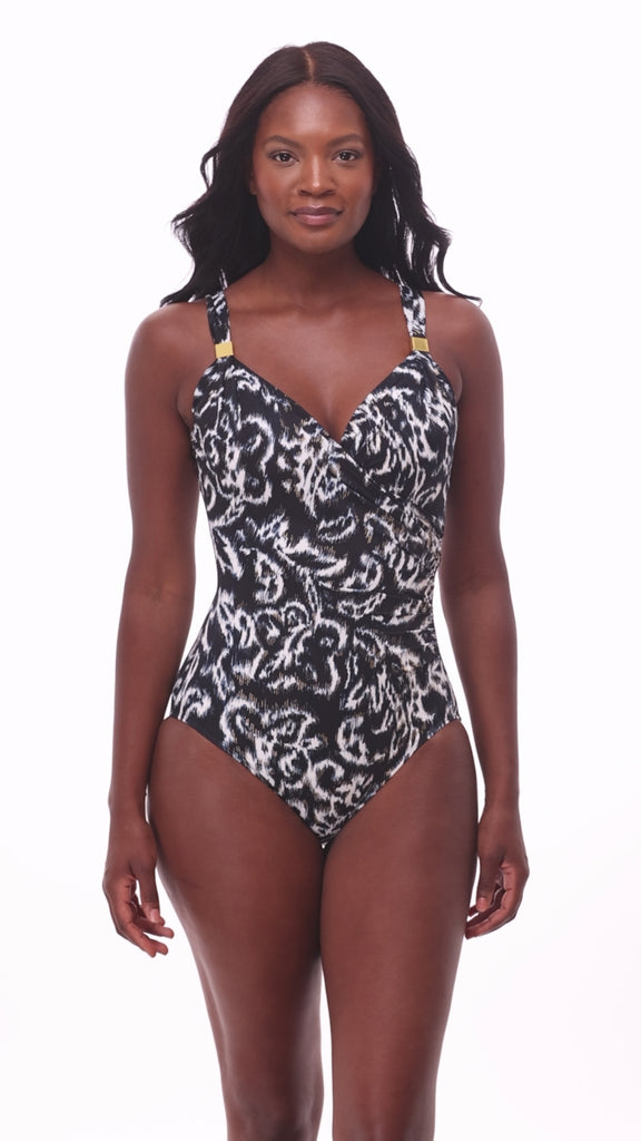 The Siren flatters with a curvaceous surplice neckline, shirred waist, and gold accents.