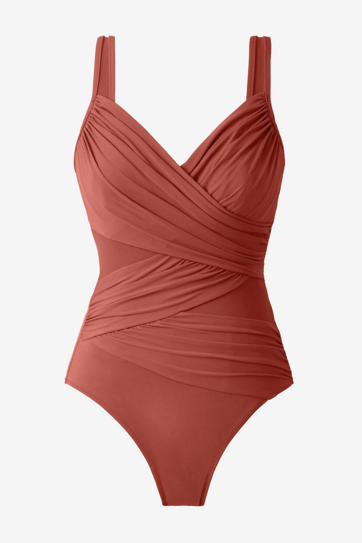 The focus stays on you in the Miraclesuit DD-Cup Solid Madero Swimsuit, as thicker, super comfy, and adjustable shoulder straps lead to a classic v-neckline. Pronounced shirring and peek-a-boo mesh detailing extends across the waist and hips providing undeniable coverage, all-over control and just the right amount of sexy. A hidden underwire bra and scoop back work hand in hand to offer the support you crave in a solidly stunning one-piece. And DD-cup bra coverage? We'll take one in every color, please!