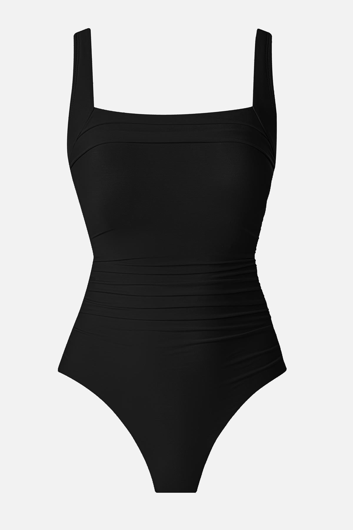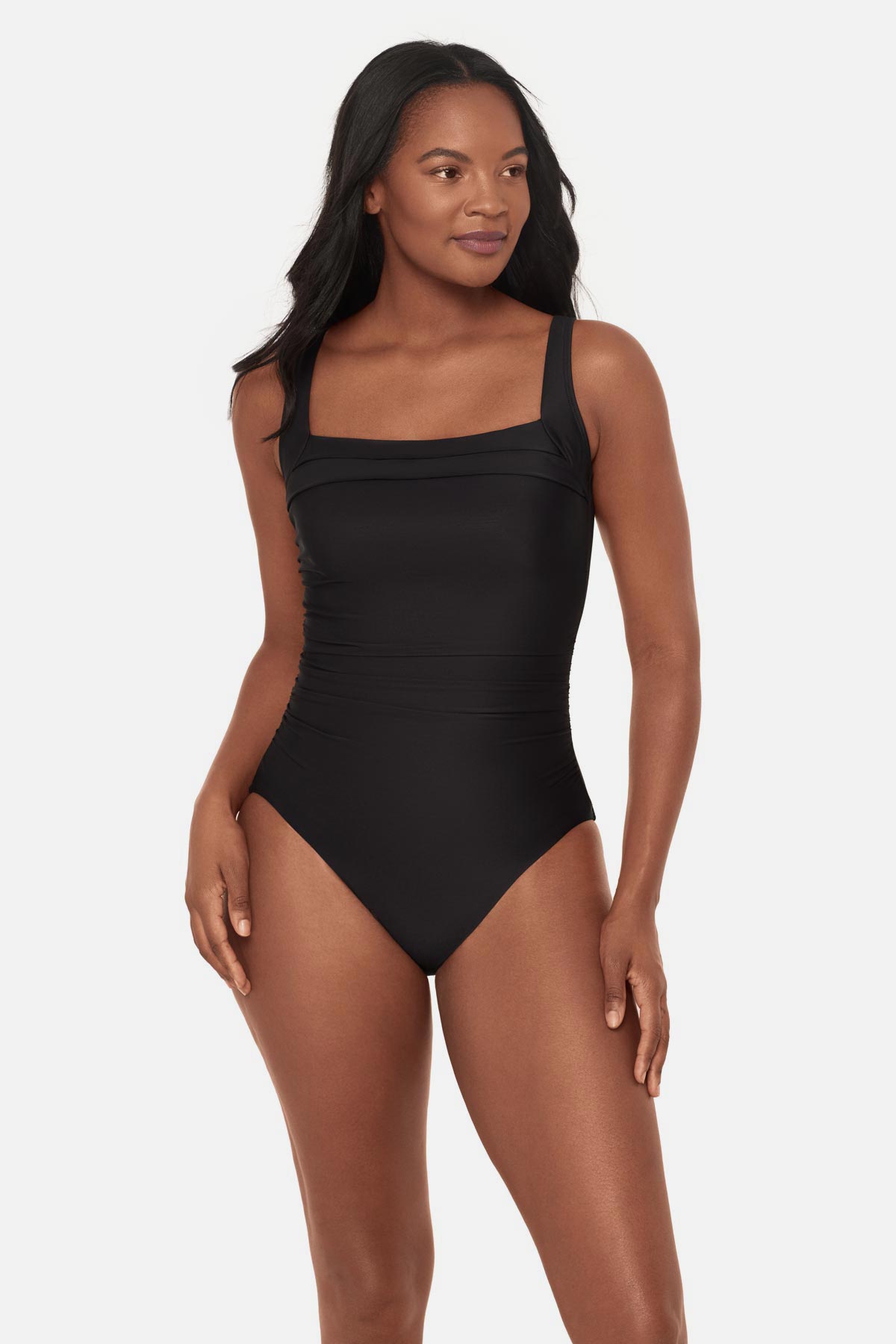• Cleverly draped fabric conceals tummy