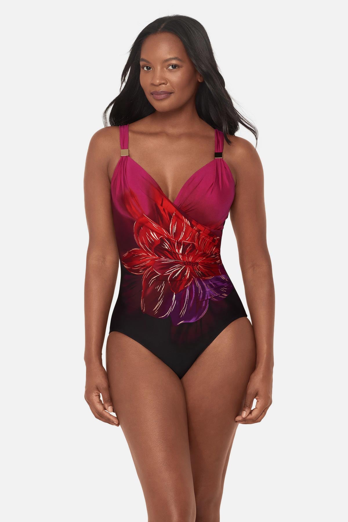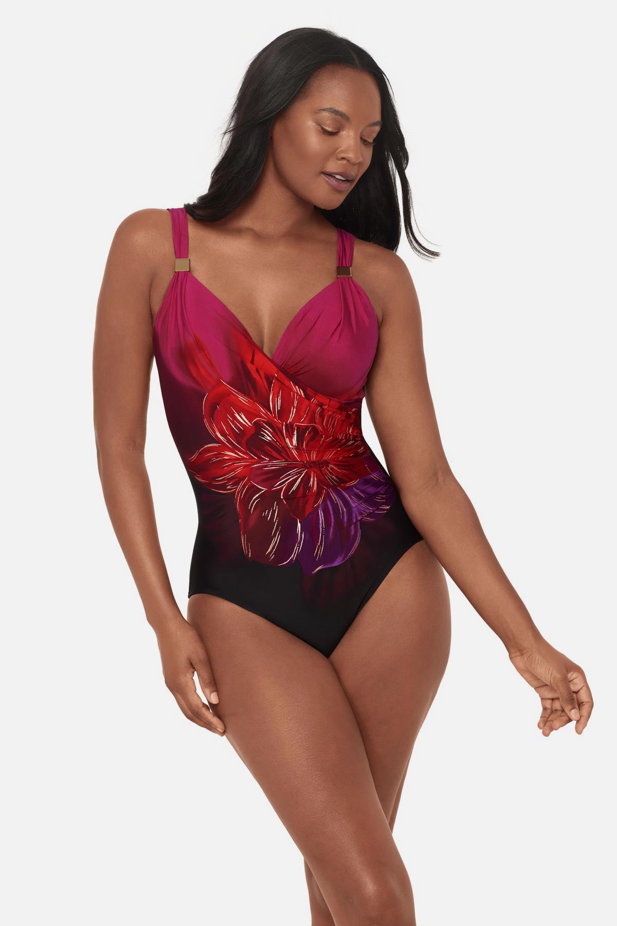 • Cleverly draped fabric conceals tummy, coordinating hardware detail at the strap