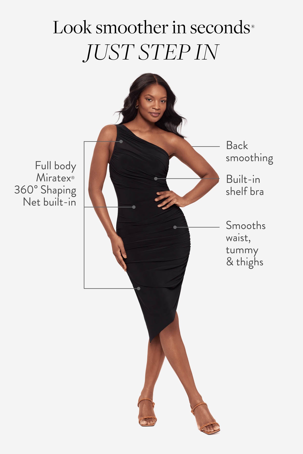 Powered by Miratex® 360° Shaping Net: invisible targeted compression for tummy, waist & thighs. Plus built-in bust support and back smoothing.