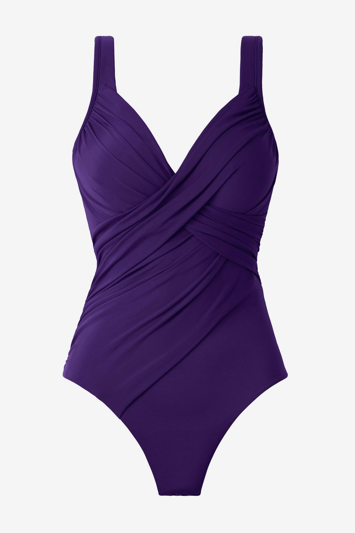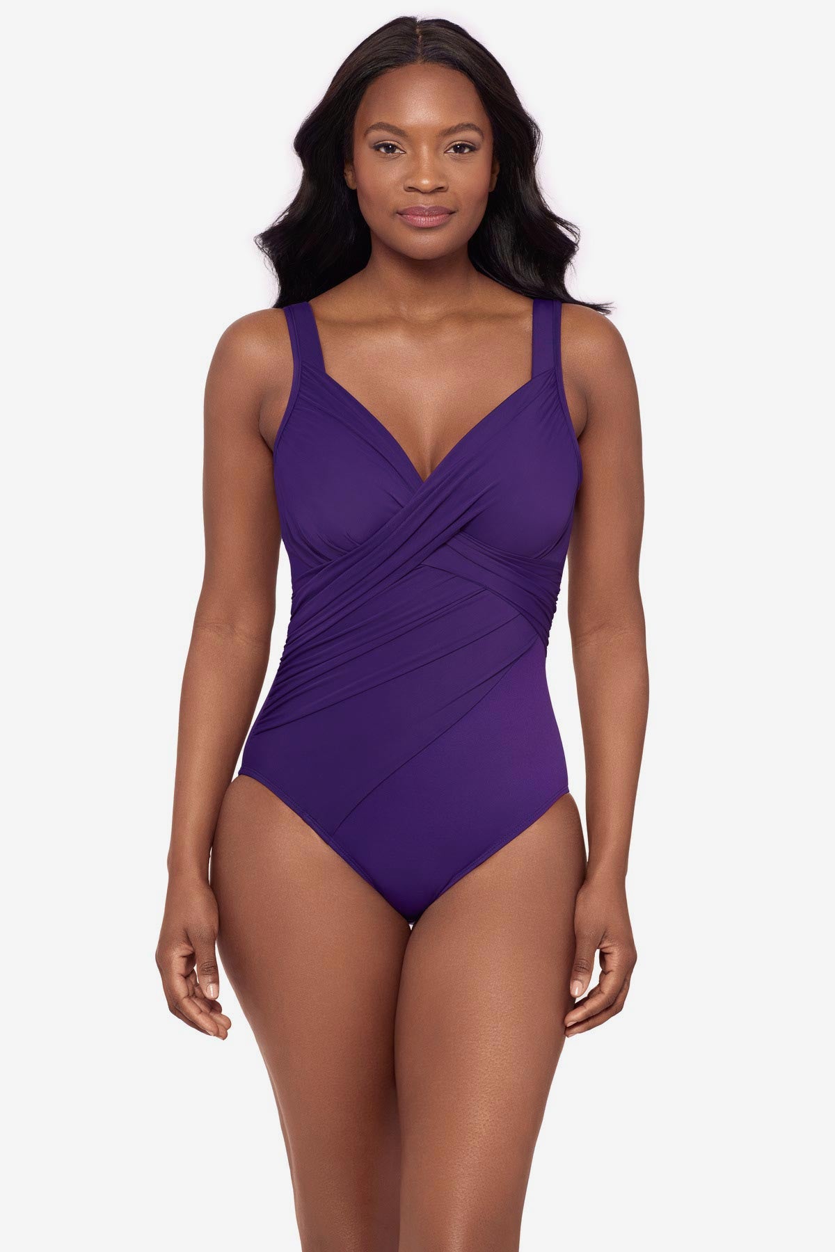 Come as you are and leave a sensational swim maven in the Miraclesuit New Revelations Revele Swimsuit, #6513019, a stunning one-piece wrapped to sophisticated splendor as a v-neckline offsets thicker set shoulder straps leading to a mid-scoop back. Front shirring and draping conceal every curve you may not want shown while properly showcasing your unique shape. A hidden underwire leaves you supported while quality control fabric keeps you tamed, trimmed and forever confident.