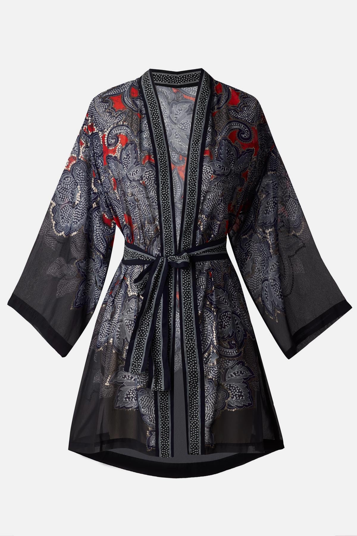 A brilliant magnolia in rich reds and deep navy, grounded against black for contrast and strength. Chic matte gunmetal shimmer accents catch just the right attention.