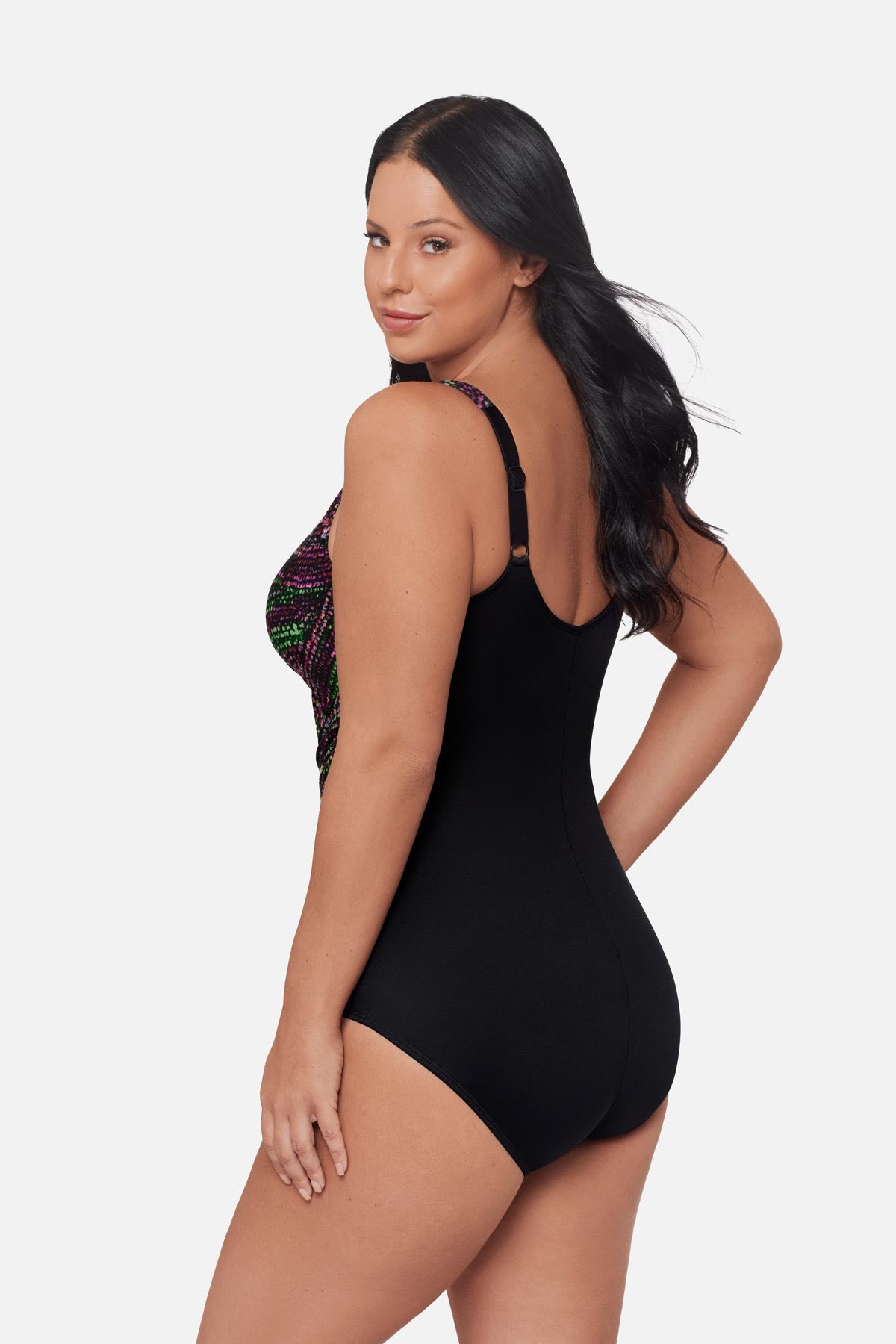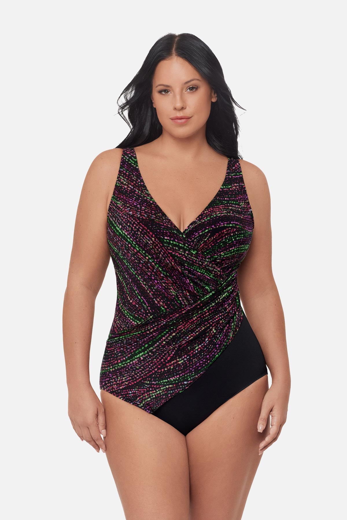 Draping through the front sculpts the waistline, while soft cups provide extra support. Cleverly draped fabric smooths and flatters the tummy for a confident fit. Shimmering beaded stripes carve a sleek hourglass illusion.