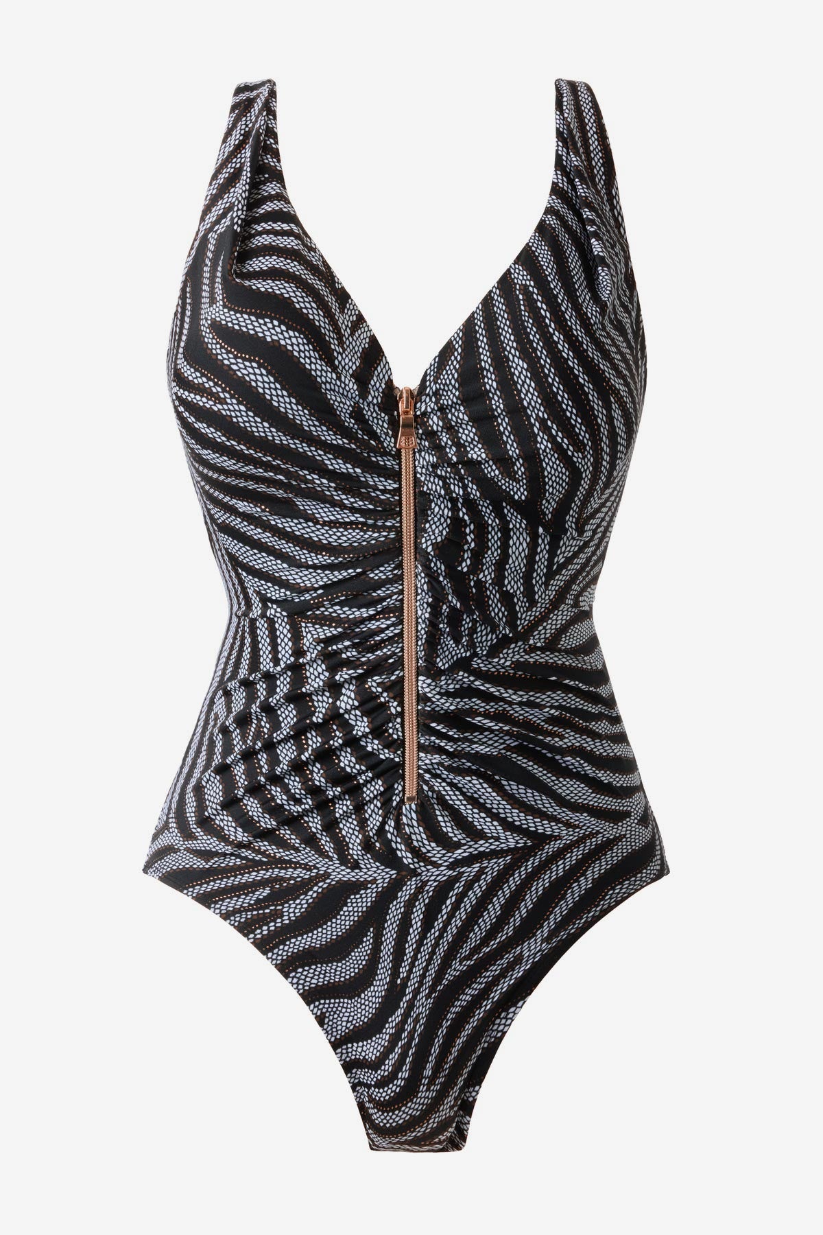 Zip-front styling creates a sculpting sweetheart neckline, as soft cups support the bust. Center front shirring contours and slims.