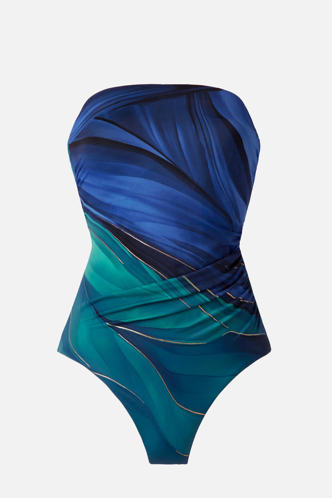 Life’s better in a bandeau. This blue multi one-piece swimsuit stays perfectly in place—straps or no straps—offering secure support without slippage. Artful shirring and full-body sculpting do the rest, enhancing your hourglass with ease.