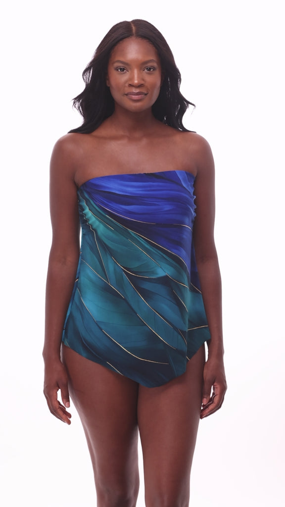 This handkerchief style tankini features a hidden underwire and silicone at the neckline for maximum support. Can be worn with or without straps for even more lift.