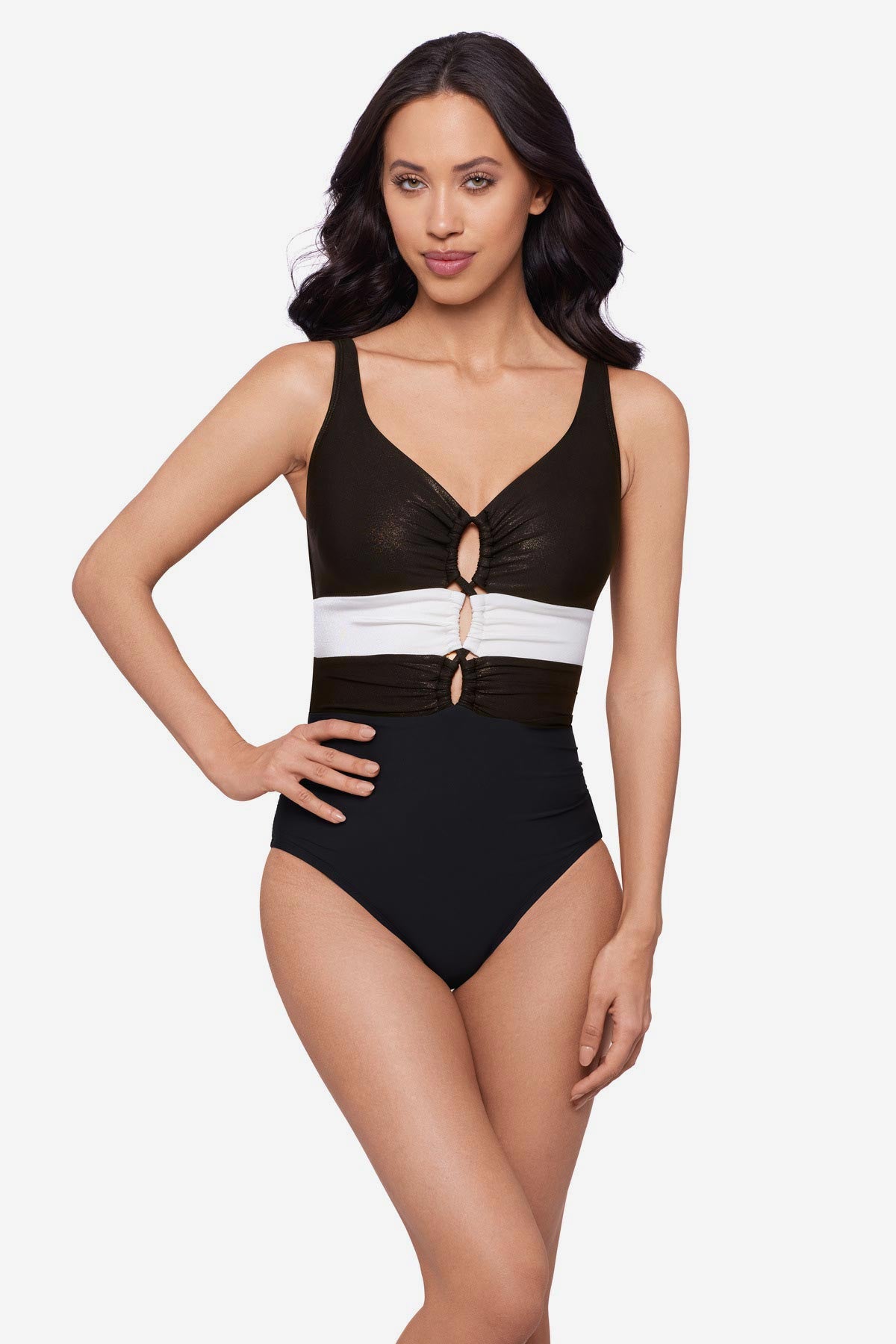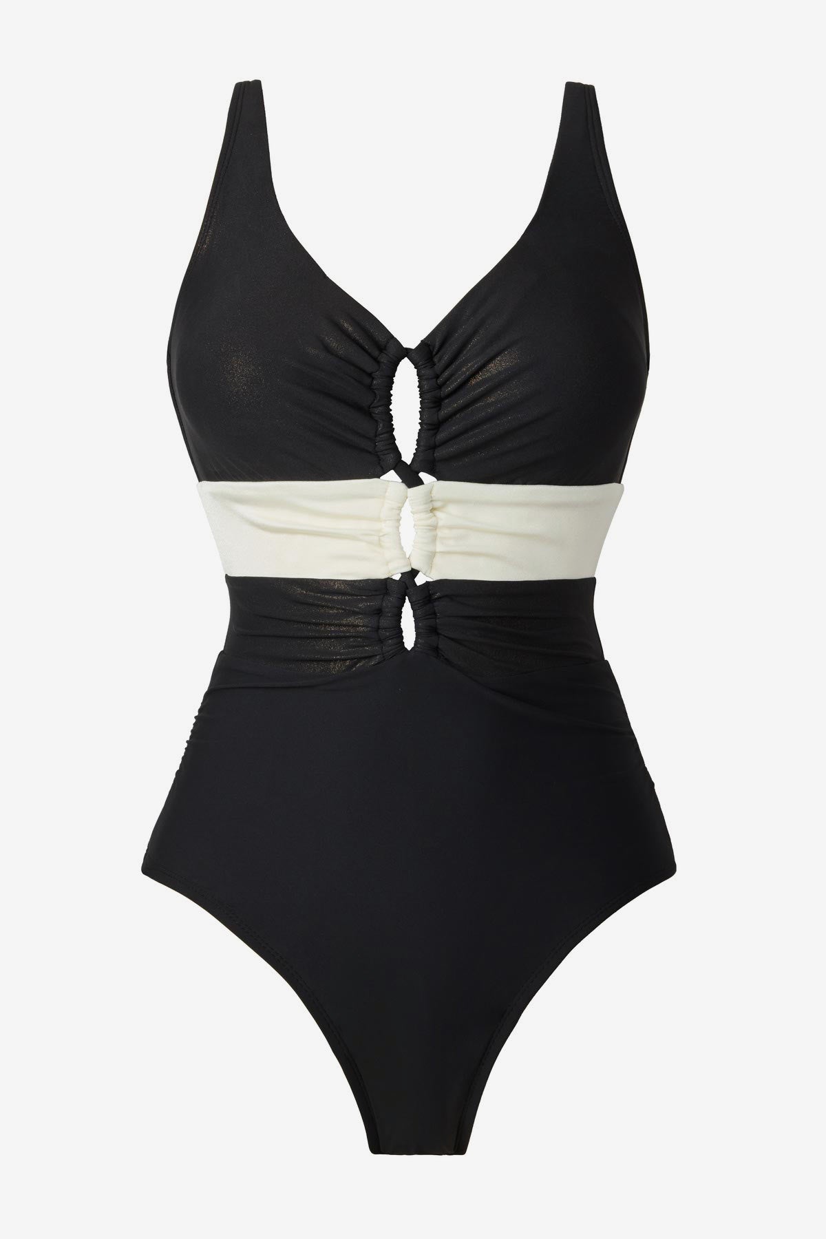 Alice sculpts with bold bands of color that carve the waist into an hourglass figure. A trio of cinched keyholes draws the eye to the neckline, balanced by soft-cup support and contour seaming.