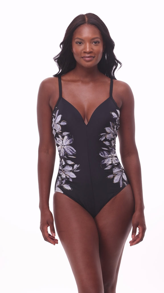 Sculpted by design. This artfully engineered print swimsuit contours your curves with precision. Side shirring adds the perfect cinch, defining your waist.