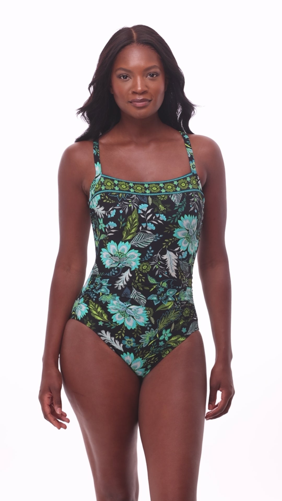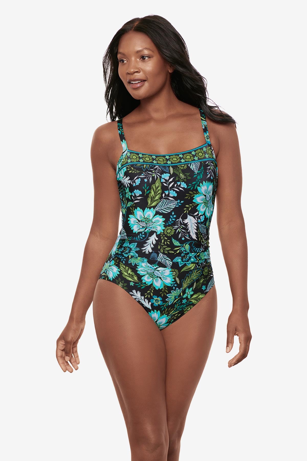 This sleek one piece features a striking and flattering square neckline. Built-in shaping smooths and supports, while soft shirring defines your waist and keeps everything in place.