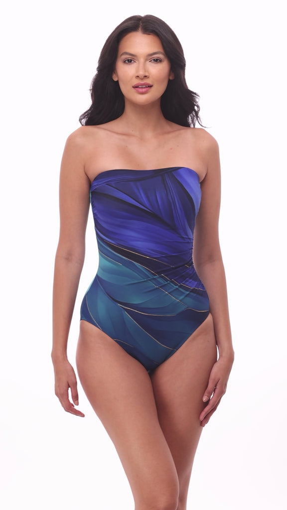 Life’s better in a bandeau. This blue multi one-piece swimsuit stays perfectly in place—straps or no straps—offering secure support without slippage. Artful shirring and full-body sculpting do the rest, enhancing your hourglass with ease.