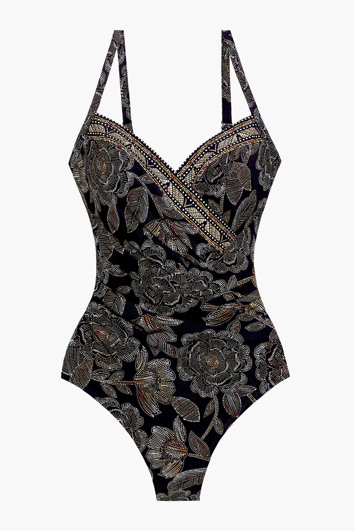Enticing under the golden sun, the Petal Pusher collection features a delicately placed floral design of golds, ivory, and garnet touches on a black base to cleverly conceal and control. Detailed necklines of shimmery gold draw the eye upward while brand new body Gali has the perfect plunging neckline and is artfully draped to accentuate for the maximum flattering effect.