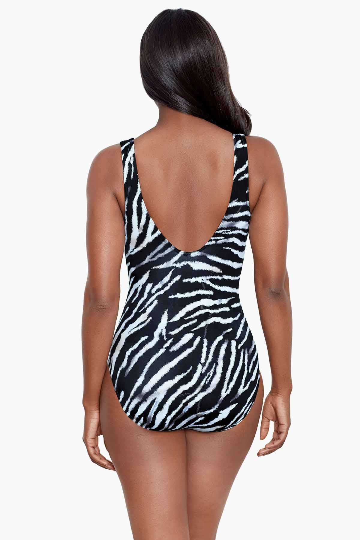 Experience the wanderlust of exotic swim in the Tigre Sombre collection, showcasing a shadowy tiger pattern of classic black and white trimmed with a delicate crosshatch of shimmery gold. Top rated Sanibel and Escape styles feature gentle shirring at the waist, exquisite necklines, and draping to slim, shape, and sculpt your silhouette.